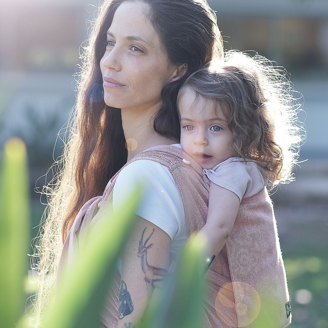 - wide, spreadable shoulder straps made from soft woven wrap material for comfortable support in any carrying position