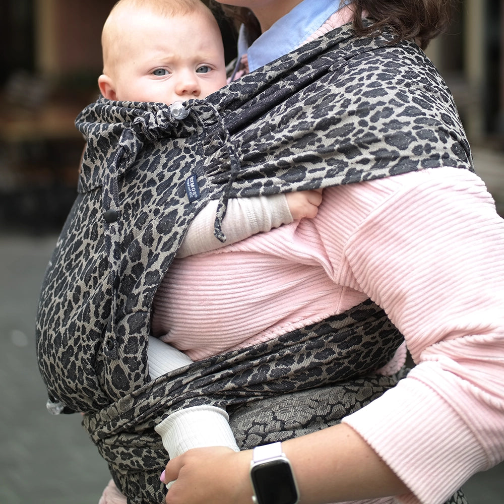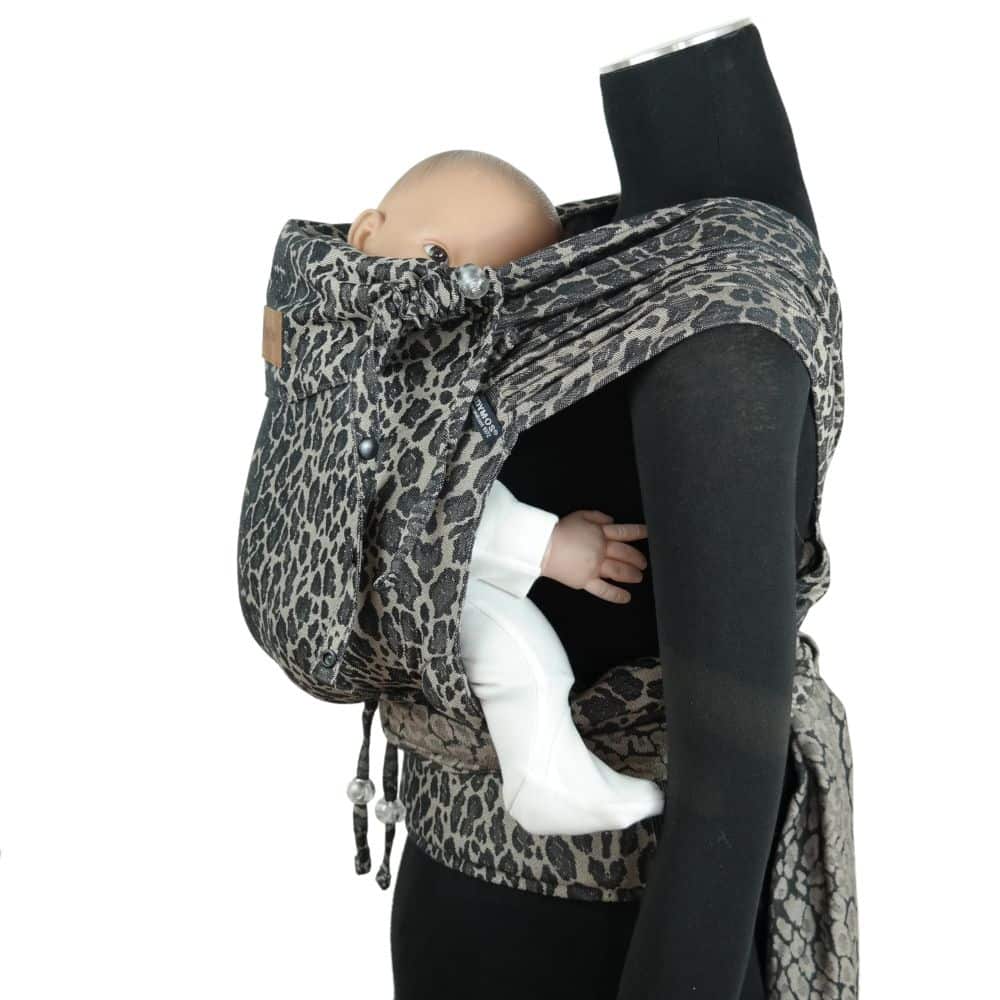 The Leo carrier has a magnificent and lively leopard pattern, which is woven in the fabric using an elaborate jacquard technique (it is not printed). The fabric in anthracite and sahara beige shows the same pattern on both sides in the opposite play of colors.