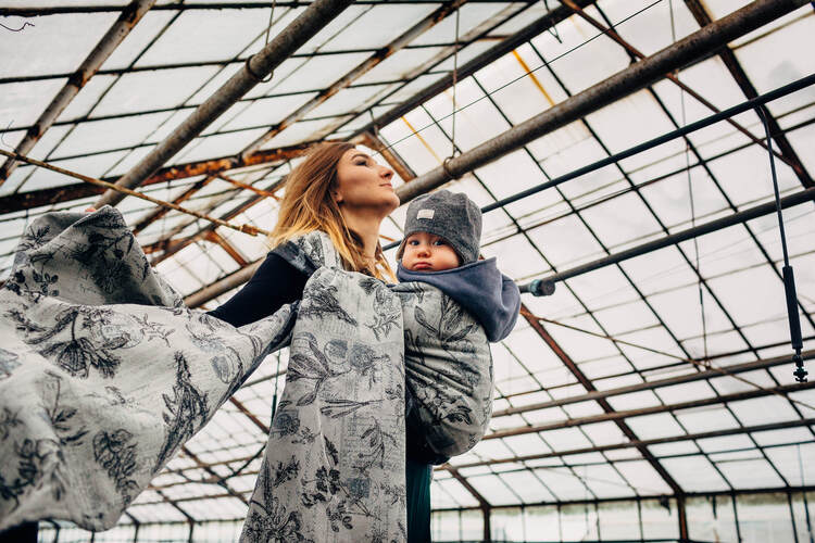 This absolutely stunning wrap is patterned with garden flowers in several grey tones. It is of medium weight and can be used throughout the entire babywearing journey from baby to toddler.