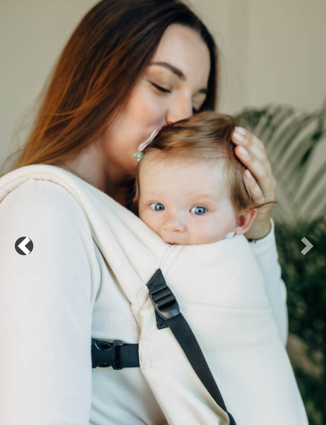 Babywearing positions: front “tummy to tummy”, back (4 months +)